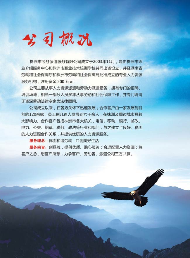 服務(wù)宗旨:創(chuàng)品牌,提供優(yōu)質(zhì)、貼心服務(wù);合理配置人力資源;急客戶(hù)之急,想客戶(hù)所想,力爭(zhēng)客戶(hù)、勞動(dòng)者、派遣公司三方共贏。
